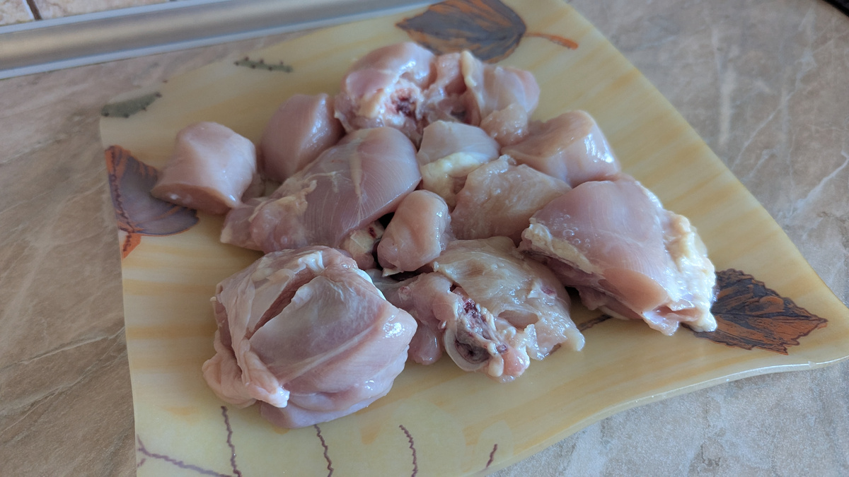 - Около 1 кг курицы (филе, бедра или набор для тушения)