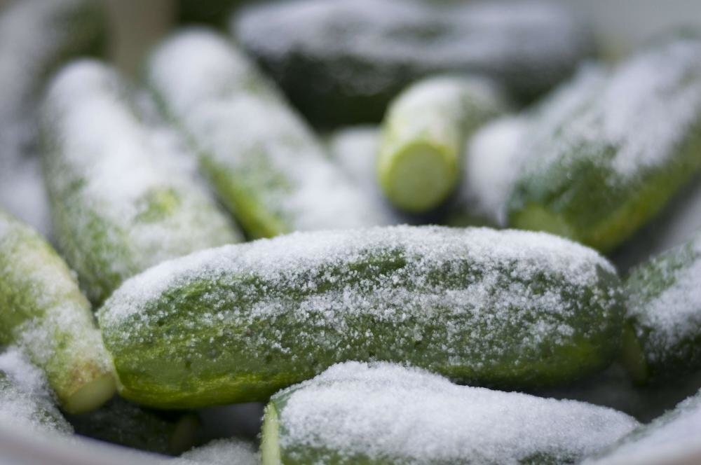 1. Тщательно вымыть корнишоны щеточкой и высушить. Уложить их слоями в контейнер или кастрюлю, пересыпая каждый слой небольшой щепоткой соли. Последний слой должен состоять из соли.