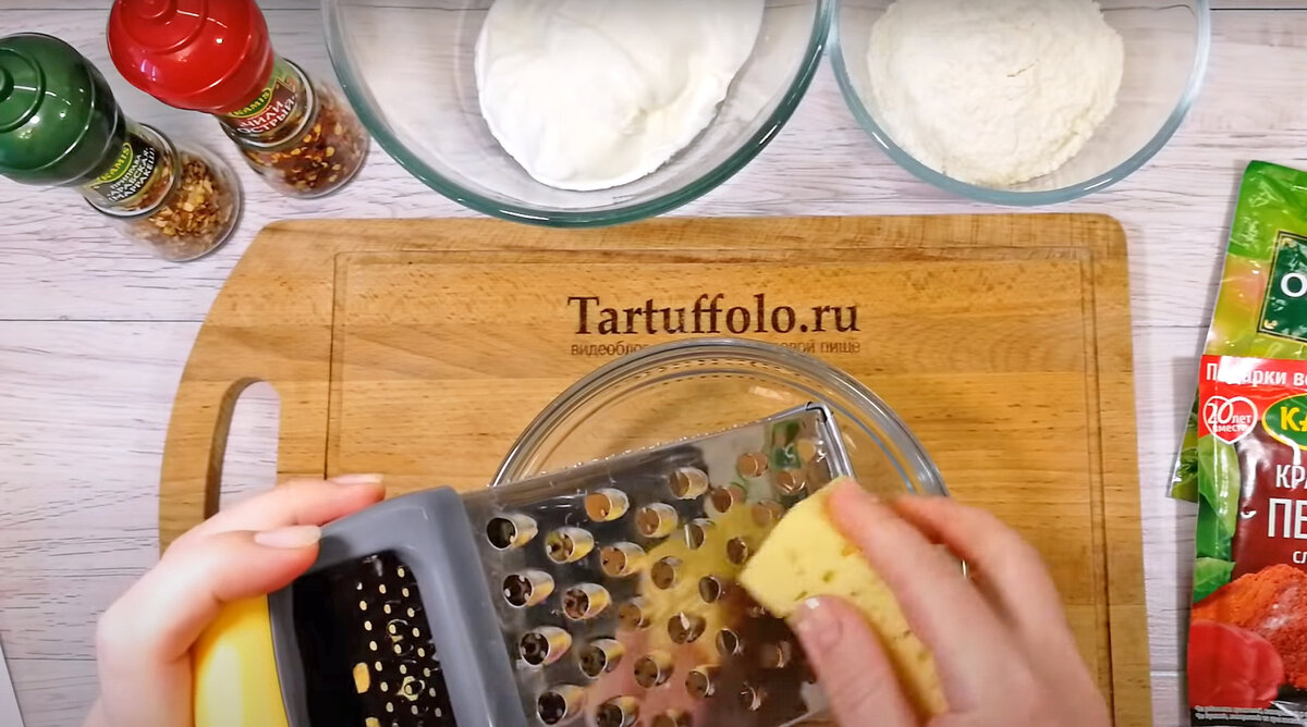 Чтобы начать, стоит разогреть духовку до 200 градусов. Далее, на крупной терке натереть 100 граммов сыра и смешать его с 200 граммами сметаны. В отдельной миске соединить 100 граммов муки с щепоткой соли и примерно четверть чайной ложки соды, а затем тщательно перемешать.