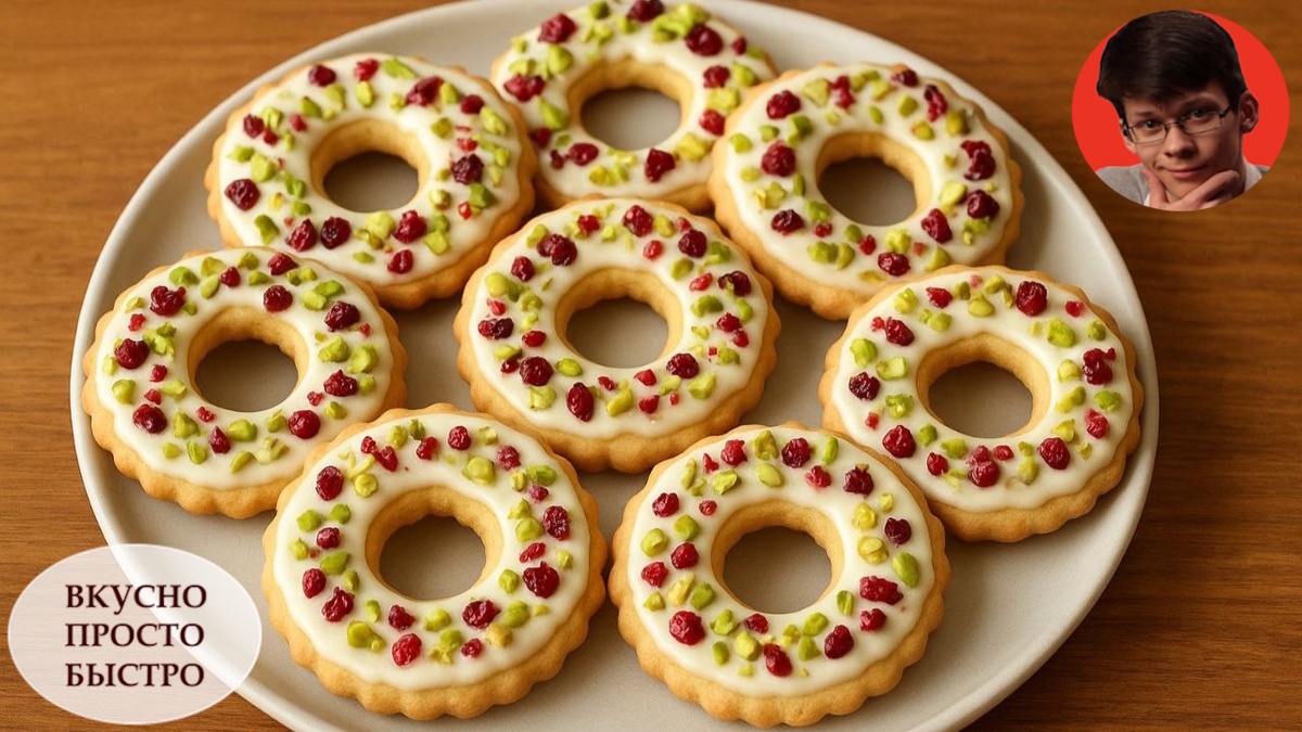Эти удивительные веночки — больше чем просто печенье, они создают настоящую атмосферу праздника! Хрупкое песочное тесто с пряными нотами, обогащенное белым шоколадом, рубиновой клюквой и хрустящими фисташками, станет идеальным угощением для любого праздничного стола.