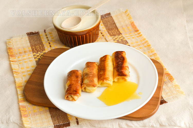 Формируйте налистники, разрезая каждый блин на 4 части. На широкую сторону укладывайте 1 ч. ложку начинки и аккуратно сворачивайте, прижимая боковые стороны. Выложите уложенные налистники в смазанную форму, сверху намажьте сливочным маслом и посыпьте сахаром.
