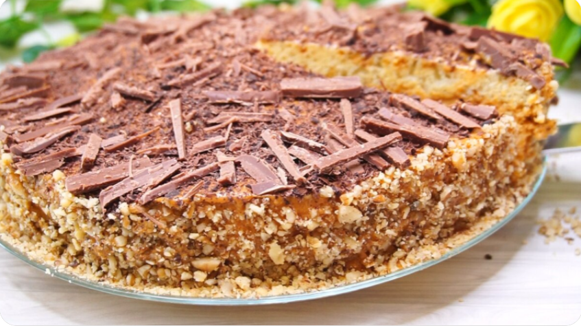 5. Когда бисквит остынет, разрезать его на 2-3 коржа, пропитать и нанести крем. Украсить по желанию: орехами или шоколадом. Пусть торт настоится 20 минут перед подачей.
