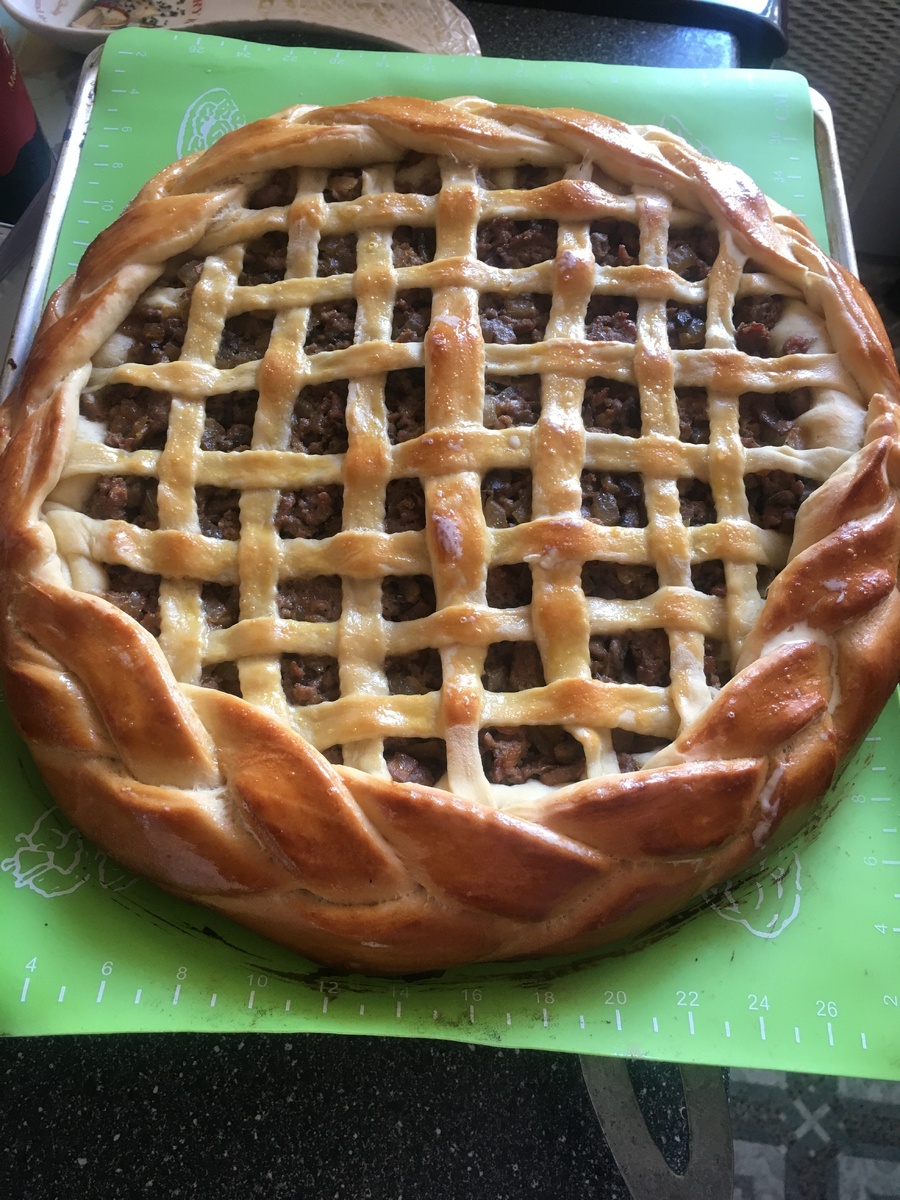 После того как тесто подошло, его делят на части, из одной делают круг определенного диаметра. На тесто укладывают мясную начинку, оставляя небольшое пространство по краям. Из остатка теста формируется бортик, например, в виде косички для придания красивого внешнего вида пирога.