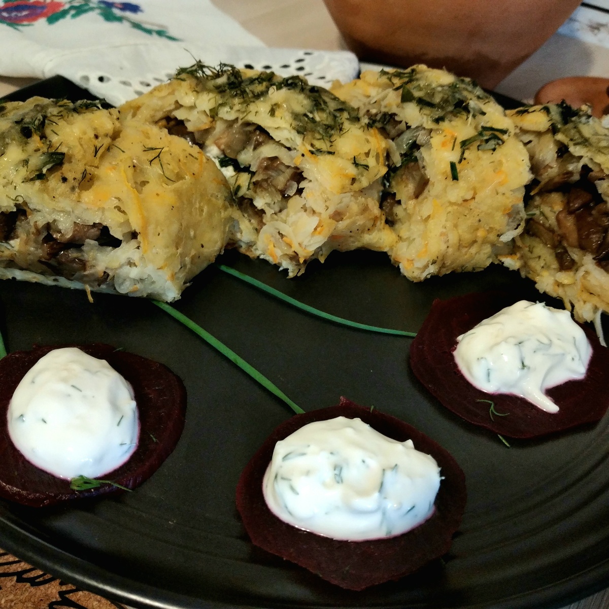 Когда рулет будет готов, дайте ему немного остыть, после чего нарежьте на порционные куски. Прекрасным дополнением станет сметана, с которой рулет раскроет весь свой вкус. Для соуса смешайте в миске чеснок, соль, оливковое масло и приправы, добавляя к сметане.