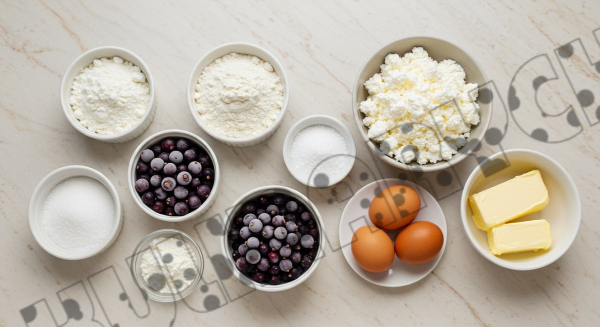 Для начала стоит позаботиться о необходимых продуктах. На чистой поверхности удобно разместите все ингредиенты. Важно, чтобы яйца, творог и масло были при комнатной температуре. Не забывайте, если ягоды замороженные — их не нужно размораживать заранее. Черная смородина идеально подходит для этого кекса, придавая ему особый, слегка терпкий вкус, который прекрасно подойдет к нежному творогу.