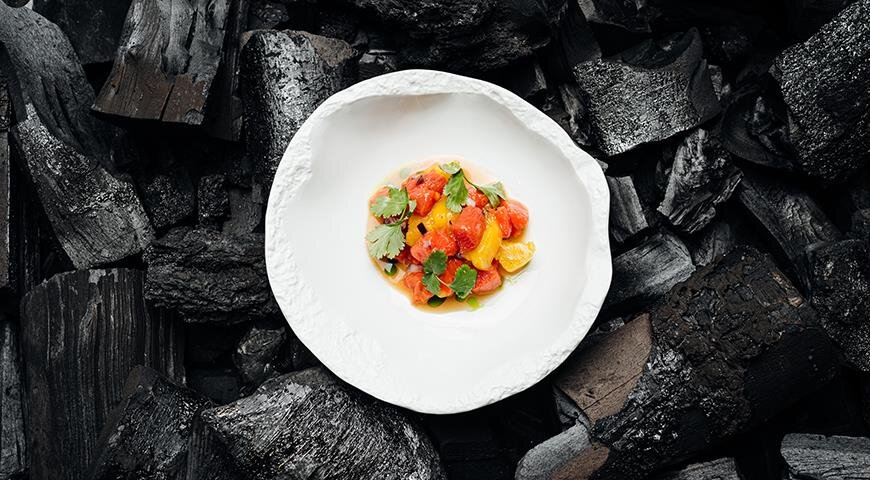 Чавыча с манго и лимонным кимчи: Этому блюду присущи оттенки экзотики, сочетающие в себе сибирские традиции и кулинарные новшества.