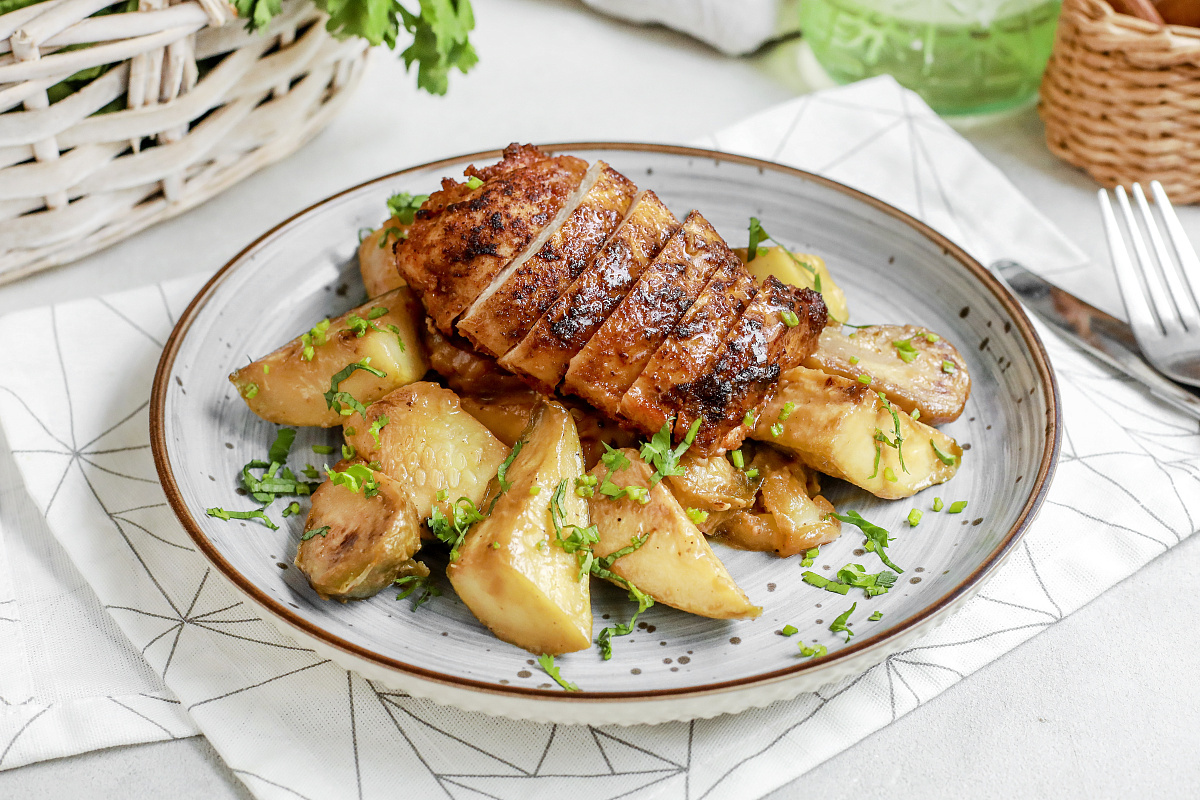 Шаг 1: Разогрейте духовку до 200°C. Куриное филе промойте и просушите. Замаринуйте его в паприке и молотом перце чили вместе с 1 ст. ложкой растительного масла. Острота перца регулируется по вкусу. Посолите и дайте мясу настояться 5-6 минут.