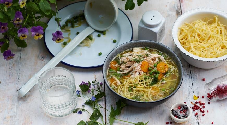 Сначала отделите мясо от половины курицы-гриль, нарежьте его небольшими кусочками, предварительно удалив кожу. Все кости положите в кастрюлю, залейте водой, доведите до кипения, а затем уменьшите огонь.У лука-порея отрежьте зелёную часть, промойте и добавьте в кастрюлю к куриным остаткам вместе с "попками" морковок, раздавленным чесноком и стеблями укропа. Подсолите по вкусу и варите на среднем огне 20 минут. Затем процедите бульон.Белую часть порея нарежьте кружочками толщиной около 1 см, а морковь – такими же круглыми ломтиками. На большой сковороде растопите немного сливочного масла, добавьте морковь и порей, посолите и жарьте на небольшом огне около 5 минут с каждой стороны, аккуратно переворачивая, чтобы порей не развалился.Зелёный горошек припустите в небольшом количестве бульона на слабом огне в течение 3 минут. Затем добавьте кусочки курицы и чуть прогрейте. Мелко нарежьте укроп для подачи.В каждой тарелке разместите обжаренные морковь и порей, горошек и курицу. Залейте всё кипящим бульоном, посыпьте свежим укропом и подавайте на стол.Этот суп точно станет любимым блюдом в теплые дни!