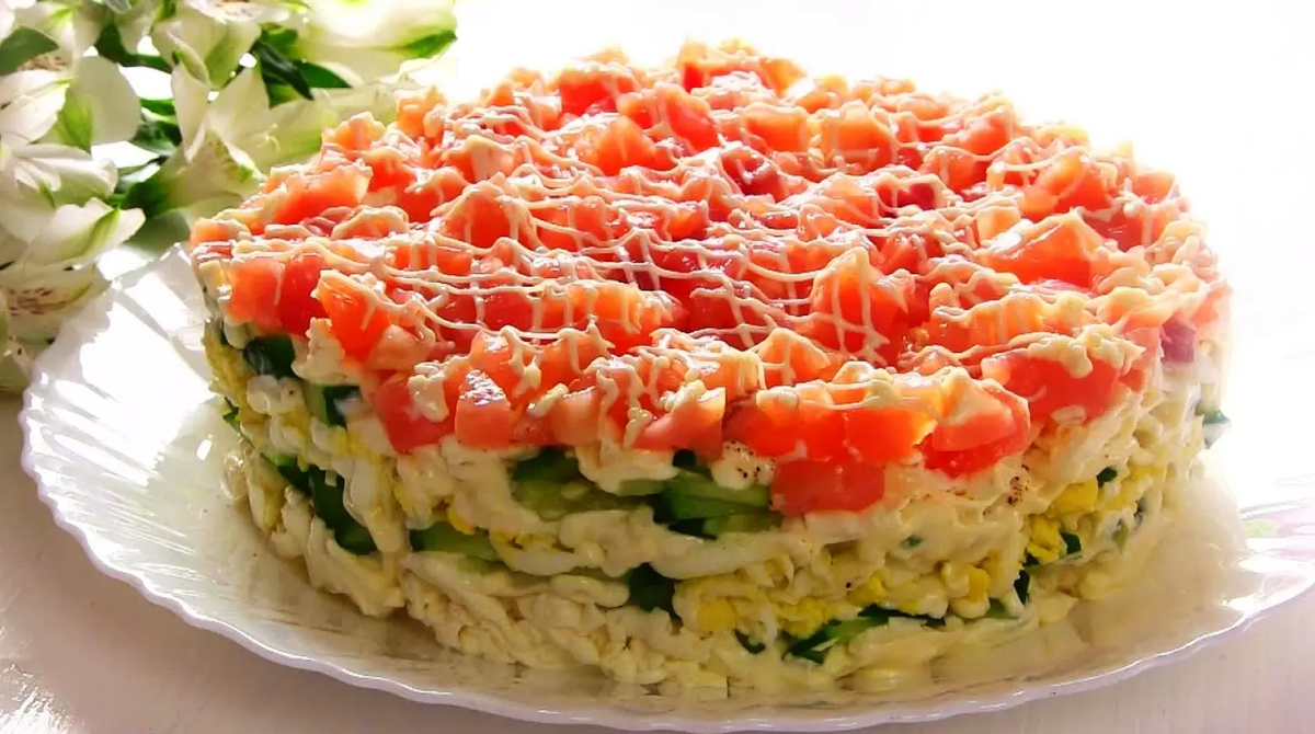 Этот изысканный слоеный салат покорит сердца всех гурманов! Каждому любителю кулинарии стоит попробовать этот оригинальный рецепт, в котором можно варьировать ингредиенты по собственным предпочтениям и возможностям.