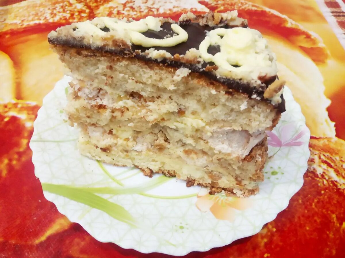 Бисквит нарежьте на три коржа, пропитайте сиропом, чередуя с слоями крема и орехов. Вершину украсьте безе и глазурью.