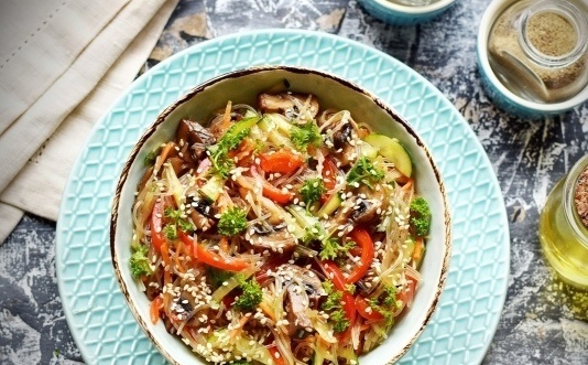 Вдохновившись азиатской кухней, предлагается попробовать насыщенный и сытный салат с фунчозой, свежими овощами и ароматными шампиньонами. Это блюдо станет идеальным выбором как для повседневного обеда, так и для уютного домашнего вечера.