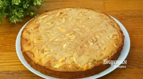 Далее тесто выливается в подготовленную форму (22-24 см) и сверху аккуратно выкладывается творожная начинка. Пирог выпекается в разогретой до 170 градусов духовке около 30 минут. Готовность можно проверить, воспользовавшись зубочисткой.