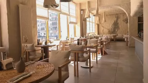 Интерьеры ресторана явно отражают задумку создателей: два зала — «светлый» и «темный» — с открытыми кухнями, создают атмосферу уюта и стиля. Дизайн выполнен в деликатных тонах с использованием дорогих материалов — бежевые стены, словно сделанные вручную, столы из тщательно обработанного дерева и посуда с фирменной символикой. Здесь царит дорогая простота.