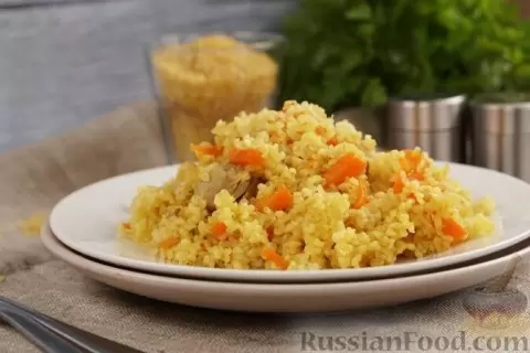 - Булгур с курицей – отличие этого блюда заключается в нежности и аромате. Поджаренные кусочки куриного филе в сочетании с булгуром создают полноценный и сытный прием пищи.