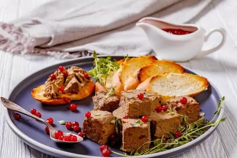 - Готовность проверяется деревянной шпажкой. После выпекания, паштет охлаждается и сервируется с гренками и свежими овощами.