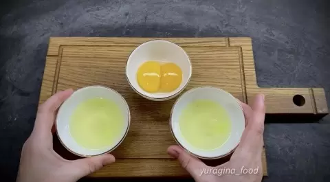 Для начала яйца нужно разделить на белки и желтки, поместив белки в отдельные ёмкости. Затем один из белков взбивается миксером на средней скорости. Когда он начнет пениться, добавляется первая ложка сахара, и взбивание продолжается до достижения устойчивых пиков.