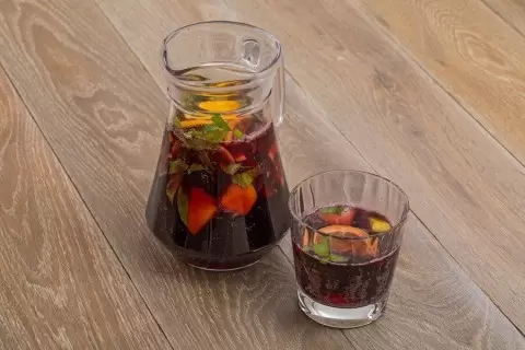 Начните с охлаждения газированной воды.Нарежьте лимон и апельсин на дольки.Персик и грушу также порежьте крупными кусками, предварительно очистив от косточек и семян.Листья мяты нарежьте тонкими полосками.На дно графина положите мяту, затем добавьте цитрусовые и нарезанные фрукты.Влейте виноградный сок, тщательно перемешайте и дайте настояться в холодильнике 20 минут.Перед подачей добавьте охлажденную газированную воду, перемешайте и наслаждайтесь напитком.