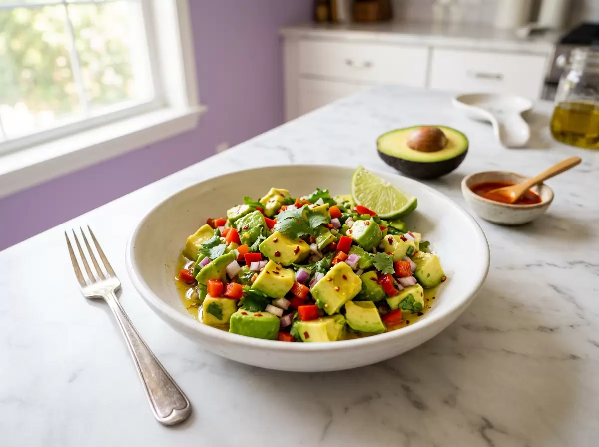 Время на кухне можно сократить, приготовив яркий и полезный салат с авокадо. Всего за 10 минут вы получите гармоничное сочетание кубиков спелого авокадо, хрустящего красного перца, лука и свежей кинзы, приправленных лаймовым соком, оливковым маслом и острым соусом. Этот салат не требует термической обработки, и, несмотря на простоту, отличается насыщенным вкусом: сливочная текстура авокадо, сладость перца, свежесть лайма и пикантность острого соуса создают отличное сочетание.