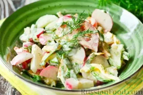 - Салат из картофеля и редиски: простое и быстрое блюдо с заправкой из сметаны, которое станет отличным гарниром к мясным блюдам.