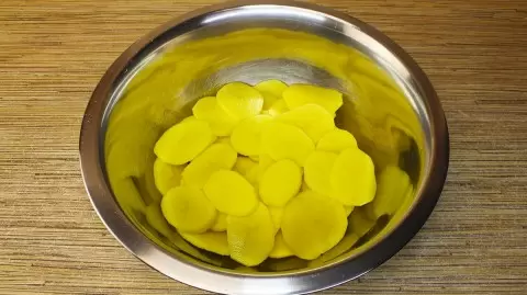 Начать нужно с подготовки картофеля. Овощи следует хорошенько помыть и очистить от кожуры. Затем нарезать их тонкими кружочками, чтобы добиться равномерного пропекания. Тонкие ломтики толщиной 1-2 мм помогут картофелю быстро приготовить.