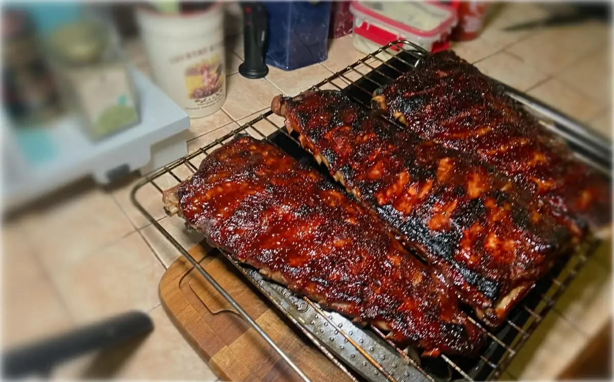 5. Выпекать рёбра, предварительно обернув их в пергамент и фольгу, в разогретой до 150°C духовке в течение 1 часа. После этого удалить фольгу и глазировать с помощью заранее приготовленного соуса, запекая при температуре 200-220°C.