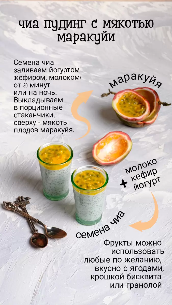 Чиа пудинг – это простой и полезный десерт, который готовится на основе семян чиа. Они впитывают жидкость и образуют необычную текстуру, а в сочетании с фруктами, такими как маракуйя, получается не только вкусно, но и очень полезно. Маракуйя вносит в пудинг экзотический вкус и аромат, делая его особенно привлекательным.