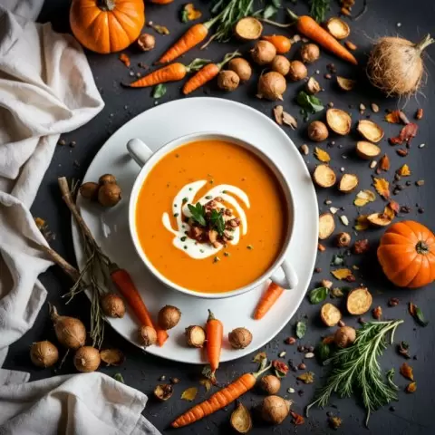 - Имбирный суп с морковью и кокосом — легкий и ароматный суп, который сочетает в себе сладость кокосового молока и яркость моркови, обогащенный острым вкусом имбиря.