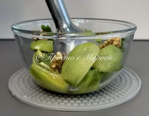 Приготовление: сначала нужно очистить киви и нарезать его произвольно. В чашу блендера отправить кусочки киви, свежую петрушку (не забудьте убрать грубые стебли), грецкие орехи и чеснок. Добавьте соль и черный перец по вкусу, мед и растительное масло. Затем все тщательно перебить до получения однородной массы.
