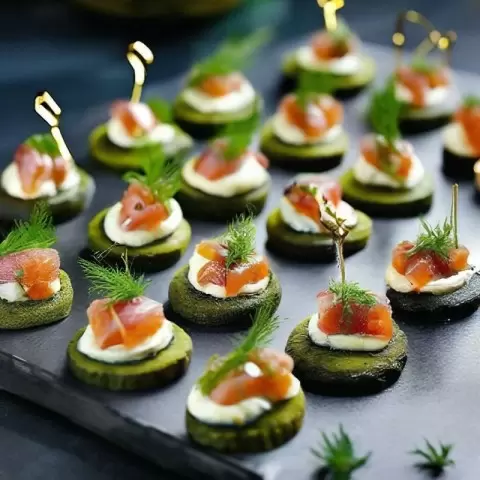 - Канапе с лососем и сливочным сыром: Используйте черный хлеб или тосты, намажьте их нежным сливочным сыром, сверху добавьте тонкие слои свежего лосося и посыпьте свежей зеленью, например, укропом.
