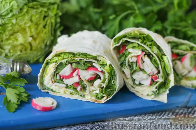 Еще одной простой и яркой закуской станет рулет из лаваша с крабовыми палочками, пекинской капустой и яйцами. Все, что вам нужно: