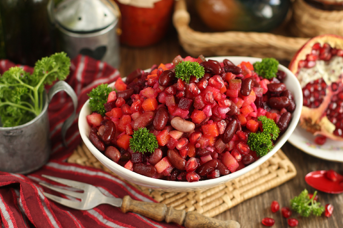 - Винегрет с фасолью и квашеной капустой. Это сытный и пикантный вариант, который добавит в привычный рецепт новые ноты. Фасоль заменяет картошку, обогащая текстуру блюда.