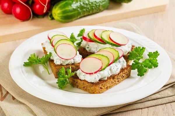 Для быстрого перекуса достаточно подрумянить кусочек хлеба на сковороде с растительным маслом, а затем добавить на него нежный творожный крем с мелко нарезанными овощами. Это сочетание не только вкусное, но и идеально подойдет для завтрака.