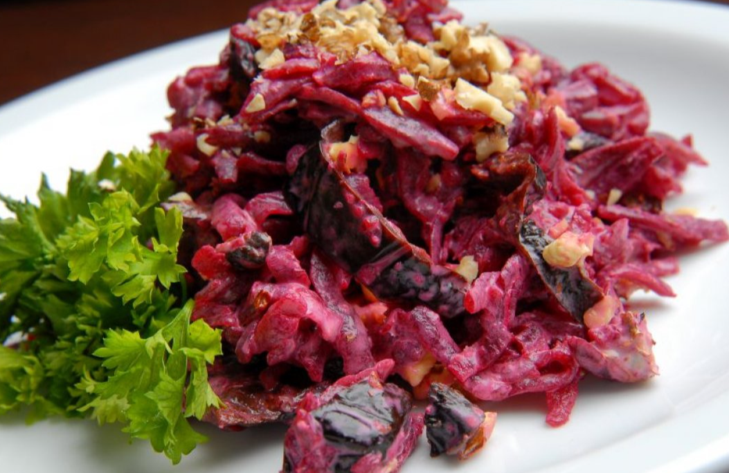 - Польза для здоровья: Свекла известна своим богатым содержанием витаминов и клетчатки. Чернослив поддерживает пищеварение, орехи наполняют организм полезными жирами, а сыр добавляет требуемые белок и кальций.