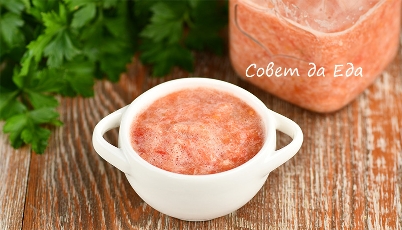 После разморозки помидоры натираются на крупной терке, оставляя кожицу на терке, а чеснок и хрен — на мелкой. Объединив все ингредиенты, добавьте соль по вкусу и тщательно перемешайте. Свежеприготовленная хреновина мгновенно добавит блеска любому блюду. Она отлично подходит к щам, борщу, мясным закускам и жареной картошке.