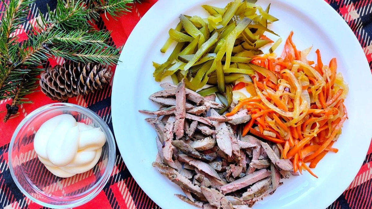 В составе этого блюда: 200 г куриной печени, 1 средняя морковь, 1 луковица и 2 соленых огурца. Все компоненты комбинируются и заправляются 2 столовыми ложками майонеза. Салат стоит подавать охлажденным, что делает его идеальным для летних дней или праздничных застолий.