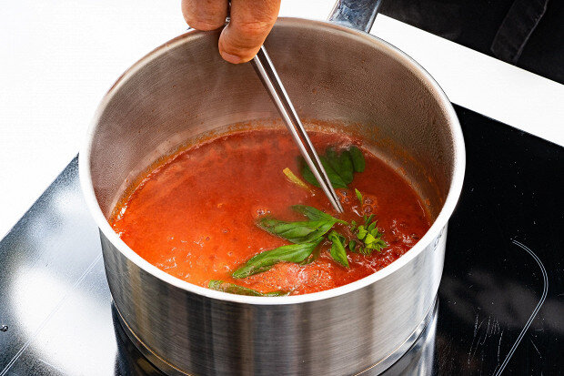 После того как чеснок будет извлечен, в соус добавляется веточка базилика. После этого соус нужно дать остыть и посолить по вкусу.
