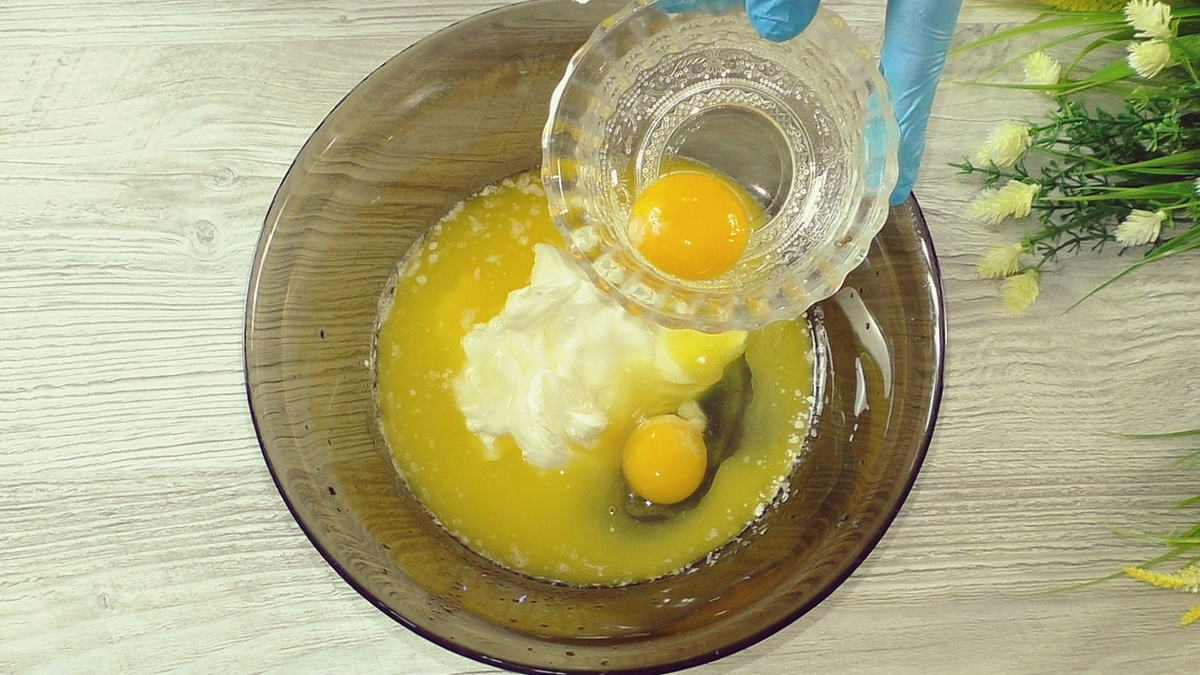 Сначала растопить сливочное масло и добавить к нему соль и сахар, тщательно перемешать. Затем включить сметану, яйцо и белок, оставив желток для смазки, и снова перемешать до однородной массы.