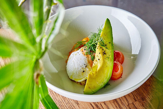 7. Завершить блюдо яйцом пашот и долькой авокадо, посыпать укропом.
