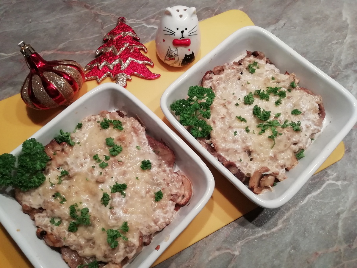 В завершение, в порционные формочки укладывают нарезанный язык, сверху викладывают обжаренные грибы, заливают ореховым соусом и посыпают тёртым пармезаном. Запекаем при температуре 180°С в течение 20 минут.