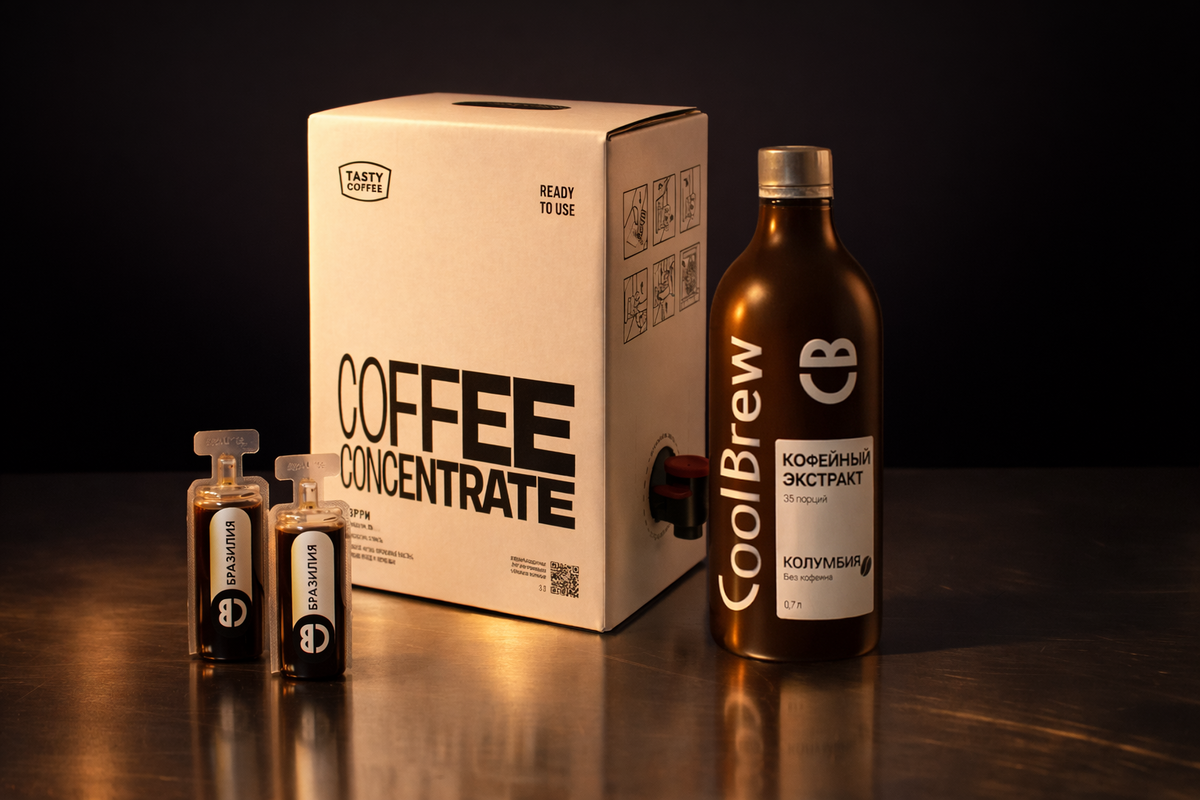 Для производства кофейного концентрата чаще всего используют зерна арабики из Бразилии, Колумбии, Эфиопии или Кении, а также их смеси. Например, компания Tasty Coffee предлагает несколько вариантов концентратов: для молочных напитков и черного кофе, включая холодные варианты.