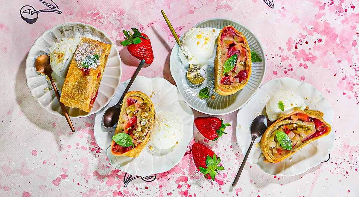 Штрудель – это не просто десерт, это культовая австрийская классика с хрустящей корочкой и сочной начинкой. Обычно его готовят с яблоками, но этот раз стоит попробовать более легкий и душистый вариант с клубникой. Сладкая клубника в сочетании с хрустящим тестом и охлаждающим мороженым превращает это лакомство в настоящий кулинарный шедевр, который произведет впечатление на любого гостя. Легкая кислинка ягод очень гармонично уравновешивается с мягкостью мороженого, создавая удивительное сочетание.