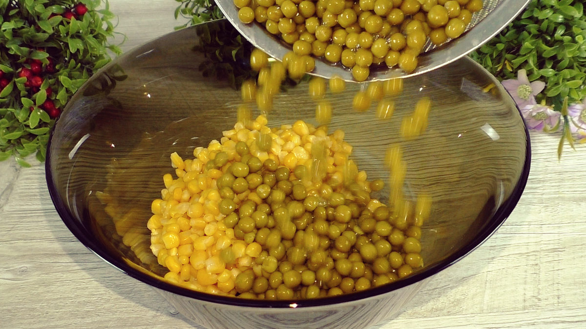 При приготовлении можно адаптировать количество консервированного горошка и кукурузы по своему вкусу. Обычно используются банки по 400 г, но и 200 г также подойдут, если нужно меньшая порция.