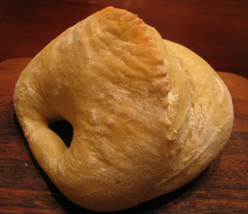 После подъема тесто выкладывают на стол, разделяют на 4-8 частей (в зависимости от желаемого размера калачей) и округляют. Каждую часть раскатывают в овал, формируют, как описано выше, и оставляют для расстойки также в тепле.