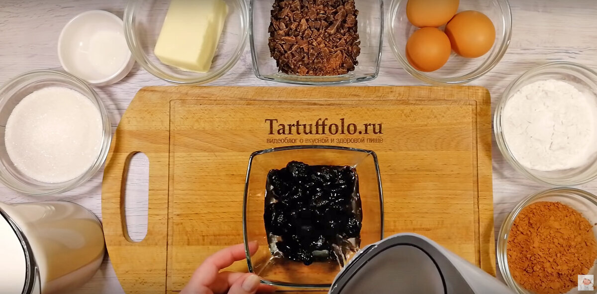 Начните с приготовления чернослива: 200 граммов сухофрукта залейте кипятком и оставьте на 10 минут для размягчения. Затем помещайте его в блендер, добавьте немного воды и столовую ложку коньяка, если хотите, и превратите всё в однородную массу.