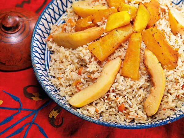 Когда нут готов, добавляется обжаренная тыква. Затем, после 10 минут, плов накрывается крышкой и томится на небольшом огне еще 15-20 минут. Подача этого блюда проходит с аккуратным выкладыванием на блюдо, делая небольшое углубление для тыквы, а айва нарезается и располагается по краям.