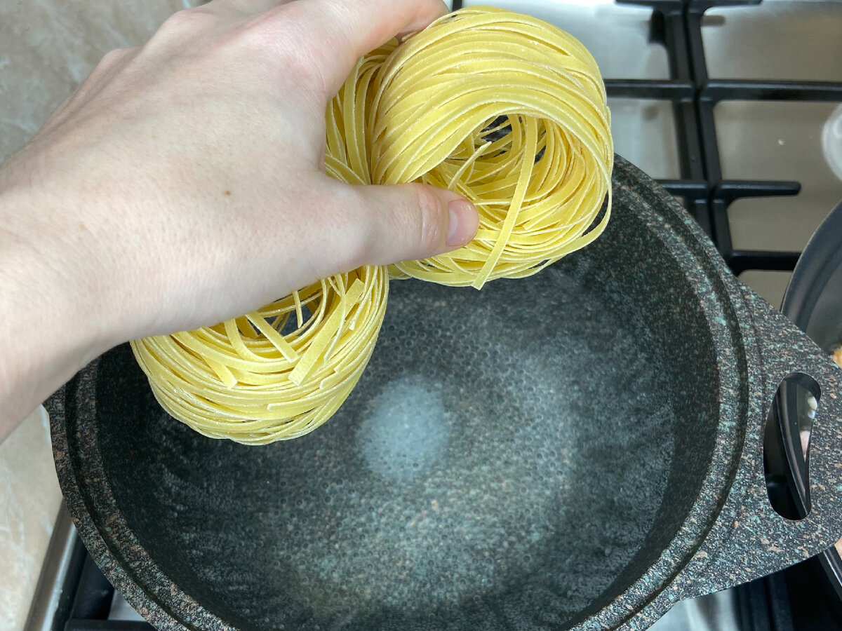 1. Налить воду в кастрюлю, добавить соль и дождаться кипения. Опустить макароны (лучше всего подойдут гнёзда) и варить до состояния аль денте.