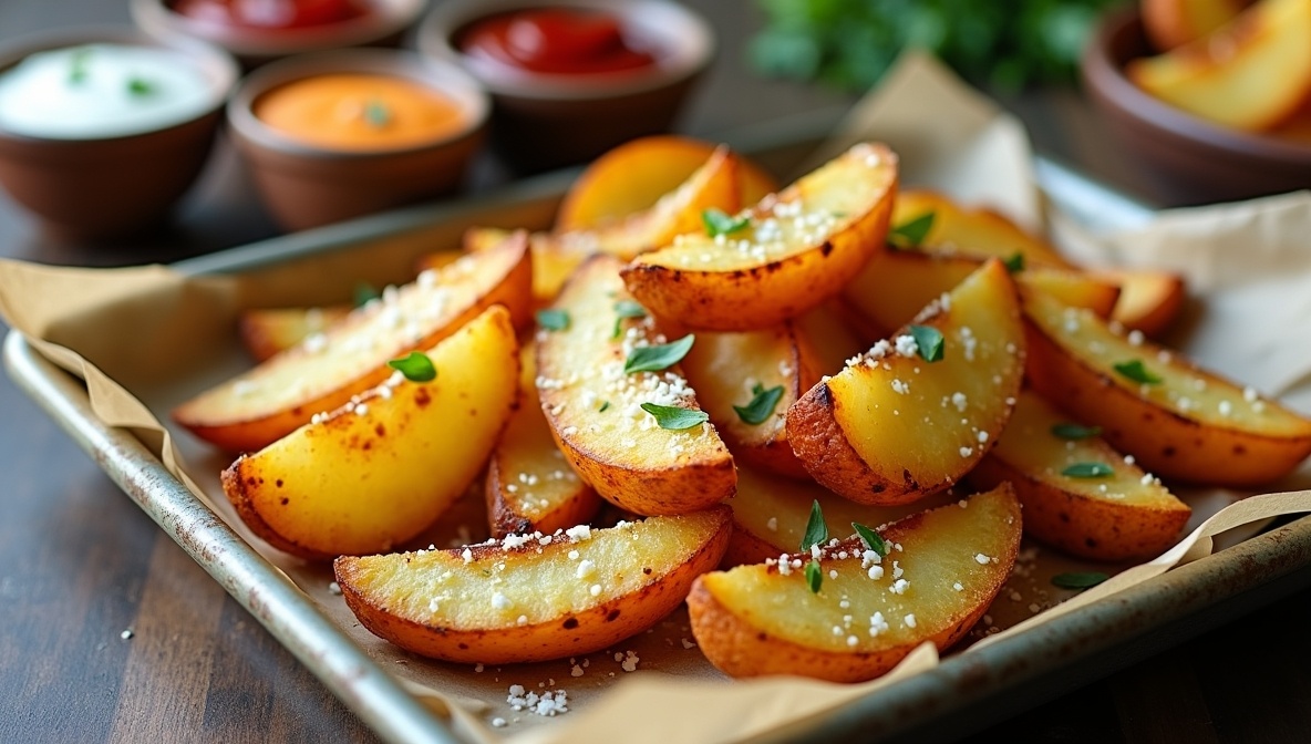 Разогрейте духовой шкаф до 200–210°C. Выложите картошку на противень в один слой, лучше на пергамент или фольгу, и запекайте 35–40 минут. После 25 минут переверните дольки. Если хотите сырную корочку, за 10 минут до готовности посыпьте тертым сыром. Готовность проверяйте с помощью вилки: если мякоть мягкая, а корочка хрустящая — все готово!