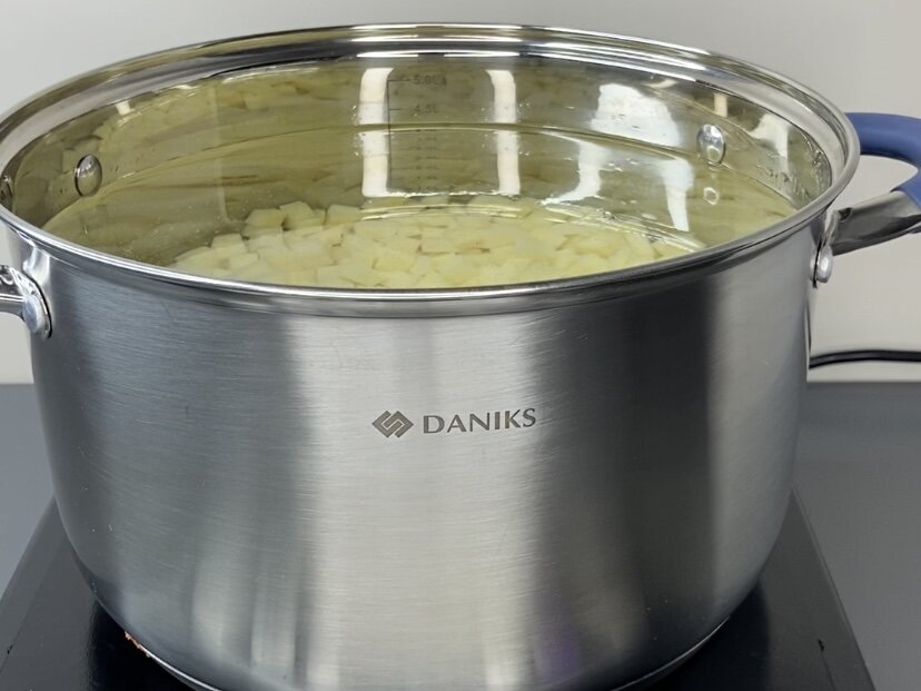 В этом рецепте борща используются щавель и, для более нежного вкуса, молодая крапива. Начинается всё с картофеля: его нужно нарезать кубиками и отправить в кастрюлю с водой.