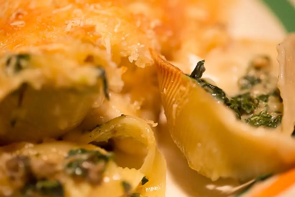 Процесс аналогичен предыдущему — фарш обжаривается с луком и чесноком, к нему добавляется шпинат, а затем формируется начинка. Эти ракушки также запекаются в духовке до готовности и подаются с зеленью.
