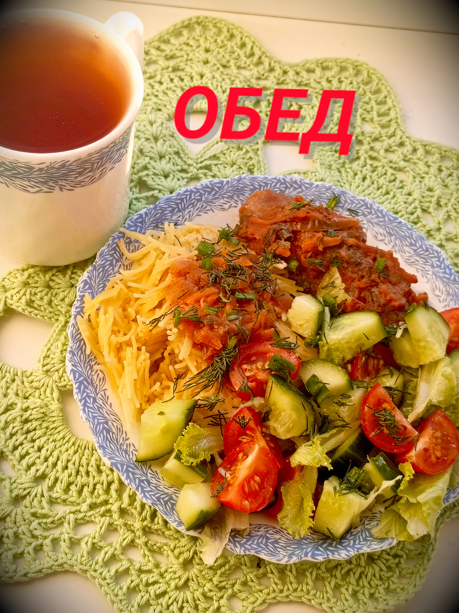 На обед сегодня на столе оказались остатки домашних кулинарных шедевров. Перед тем как приступить к трапезе, был выпит стакан горячей воды — это помогает организму подготовиться к приему пищи. За двадцать минут до обеда ароматная вермишель с домашними колбасками уже ждала на тарелке (осталась всего одна).